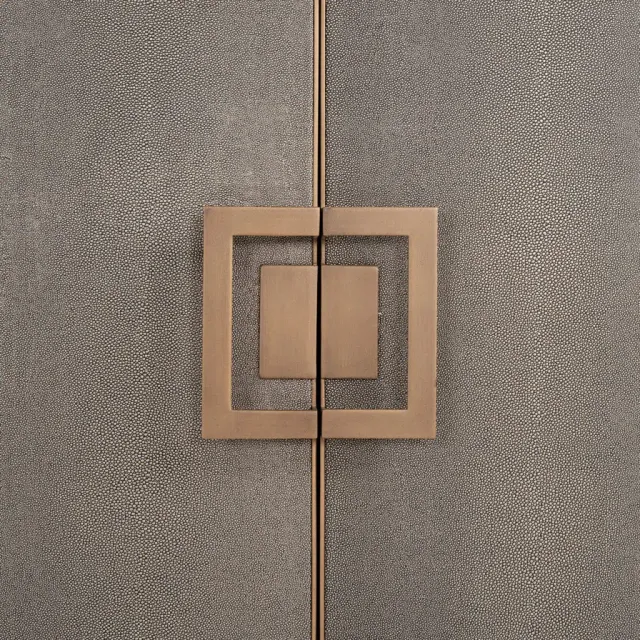 The Bloomford 2 Door Drinks Cabinet by Richmond Interiors is part of a collection that stands as a striking showcase of craftsmanship and design. Black-stained oak and brass frames form its elegant foundation, while geometric brass-coloured handles and tops introduce a refined, contemporary edge. Each surface is meticulously adorned with a finely detailed replica of shagreen hide, adding a layer of subtle texture that enhances both visual and tactile appeal.