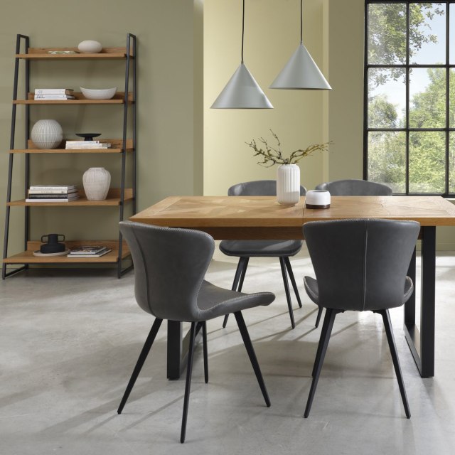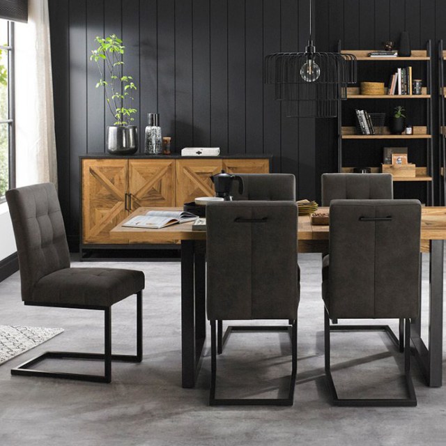 Indus is a striking range combining saw cut oak marquetry tops with a "peppercorn" finished wire brushed oak veneered frame and a welded black powder coated metal base, giving it an on trend industrial edge. Each of the hand-crafted pattern tops are wire brushed and distressed to give a rustic look and tactile feel, making the most of the beautiful and varied grain of oak. Choose from generously proportioned oak upholstered chairs in four velvet options or a mottled grey fabric or cantilever chairs that feature this same fabric in a bold square pattern stitch detail with a handle in the back and superior glides on the base for ease of manoeuvre. BLUM soft closing hidden drawers within the sideboard cabinets add that extra refinement to the range in what will create a stunning focal point in any dining room.