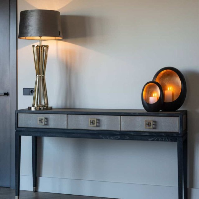 The Bloomford Console Table by Richmond Interiors is part of a collection that stands as a striking showcase of craftsmanship and design. Black-stained oak and brass frames form its elegant foundation, while geometric brass-coloured handles and tops introduce a refined, contemporary edge. Each surface is meticulously adorned with a finely detailed replica of shagreen hide, adding a layer of subtle texture that enhances both visual and tactile appeal.