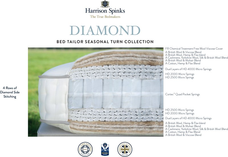 The Diamond Mattress is part of the Seasonal Turn Mattress Collection by Harrison Spinks. Each seasonal turn mattress is crafted with luxurious natural fillings, offering two distinct sleeping surfaces. One side features warm wool blends designed for winter, while the other side is made with cool cotton blends ideal for summer, ensuring optimal temperature regulation throughout the year.