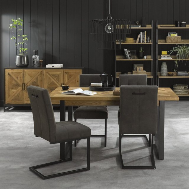 Indus is a striking range combining saw cut oak marquetry tops with a "peppercorn" finished wire brushed oak veneered frame and a welded black powder coated metal base, giving it an on trend industrial edge. Each of the hand-crafted pattern tops are wire brushed and distressed to give a rustic look and tactile feel, making the most of the beautiful and varied grain of oak. Choose from generously proportioned oak upholstered chairs in four velvet options or a mottled grey fabric or cantilever chairs that feature this same fabric in a bold square pattern stitch detail with a handle in the back and superior glides on the base for ease of manoeuvre. BLUM soft closing hidden drawers within the sideboard cabinets add that extra refinement to the range in what will create a stunning focal point in any dining room.