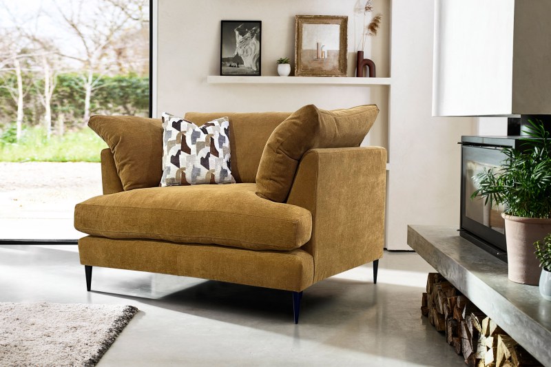Shown Opposite: Soho Snuggler in Florida Caramel, with scatters in Tivoli Chocolate. Legs in Matte Black.